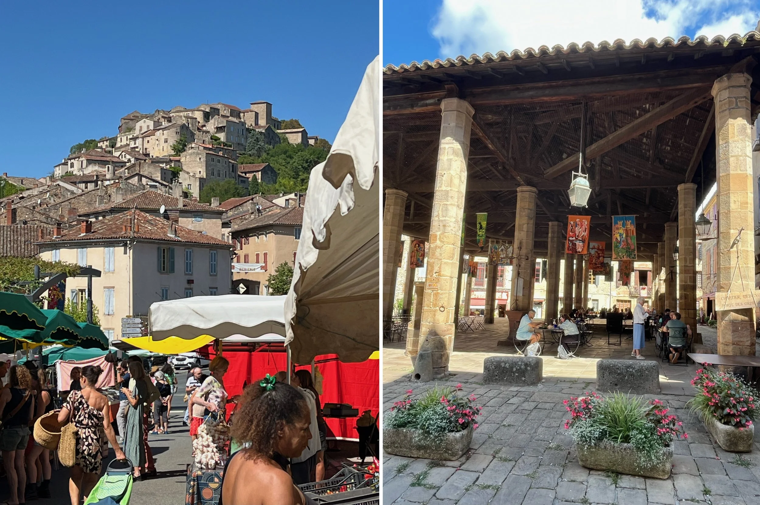 Cordes on market day, and Les Halles – the town’s old market hall