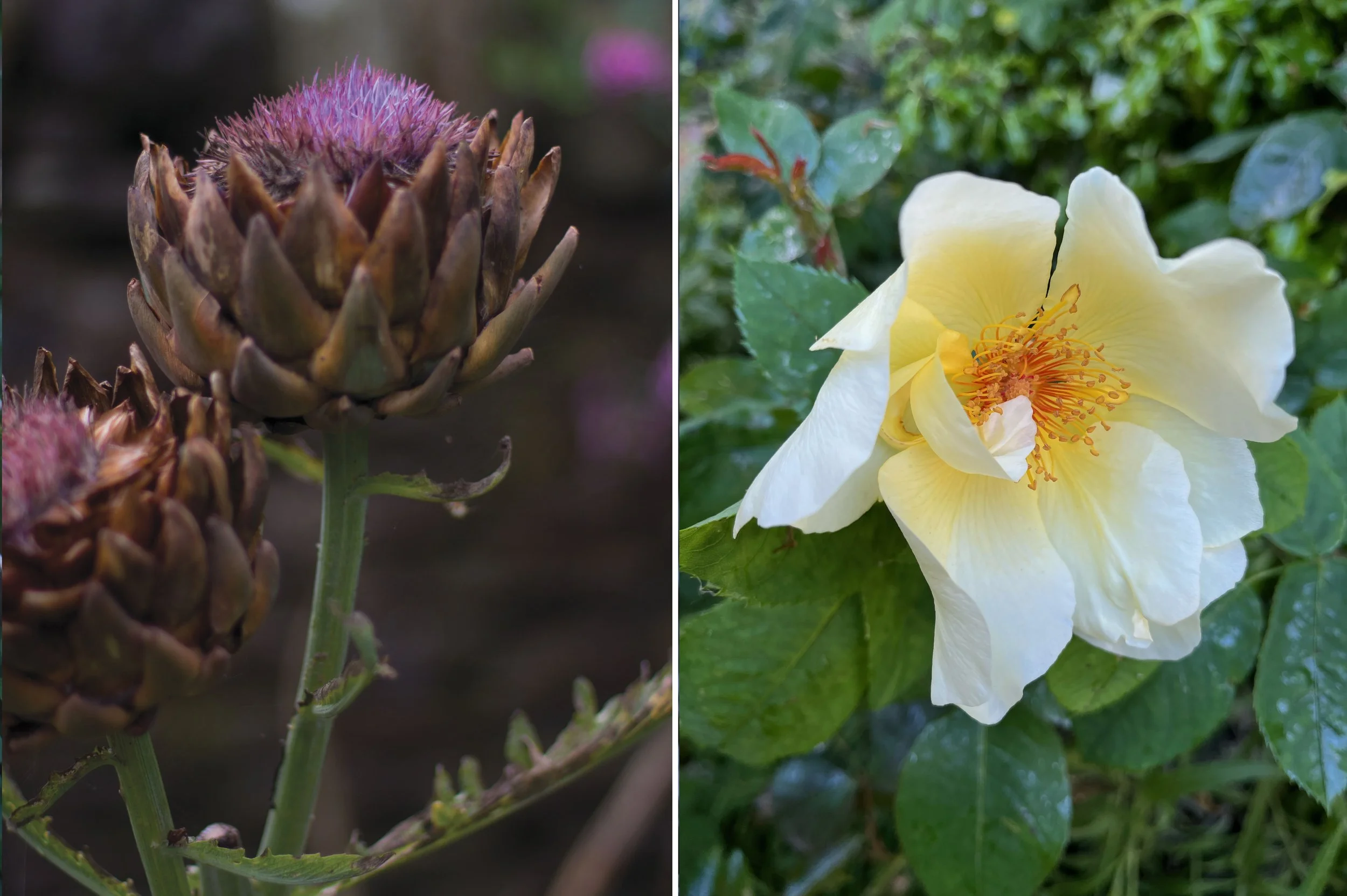 Mixed planting shows off stunning artichokes flowers, while attracting pollinators with fragrant roses